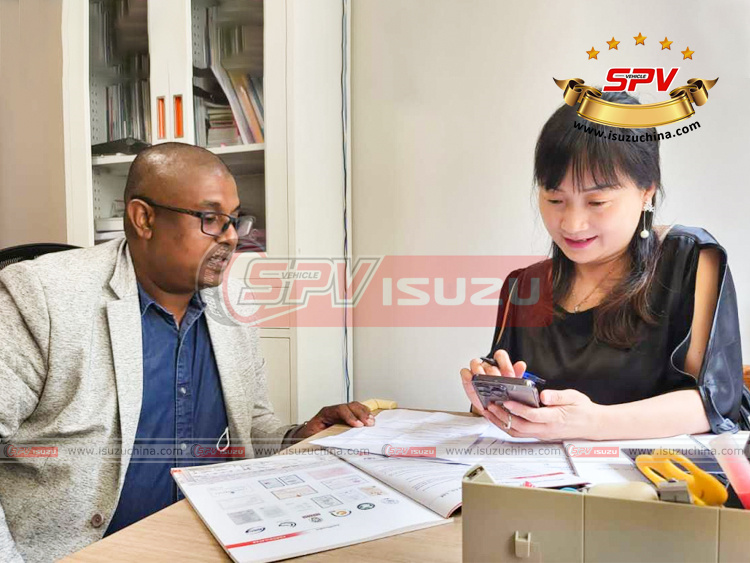 Mrs Chen and client talking about vacuum truck in Shanghai office